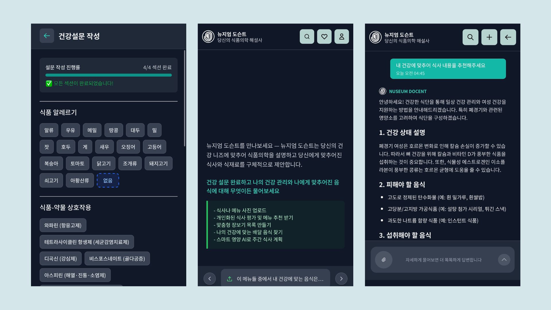 “나만의 건강 도슨트” NUSEUM DOCENT은, 데이터 기반 정밀영양 AI 엔진을 일상에 연결하는 실천형 솔루션입니다. 이제 누구나 직접 체험할 수 있습니다.